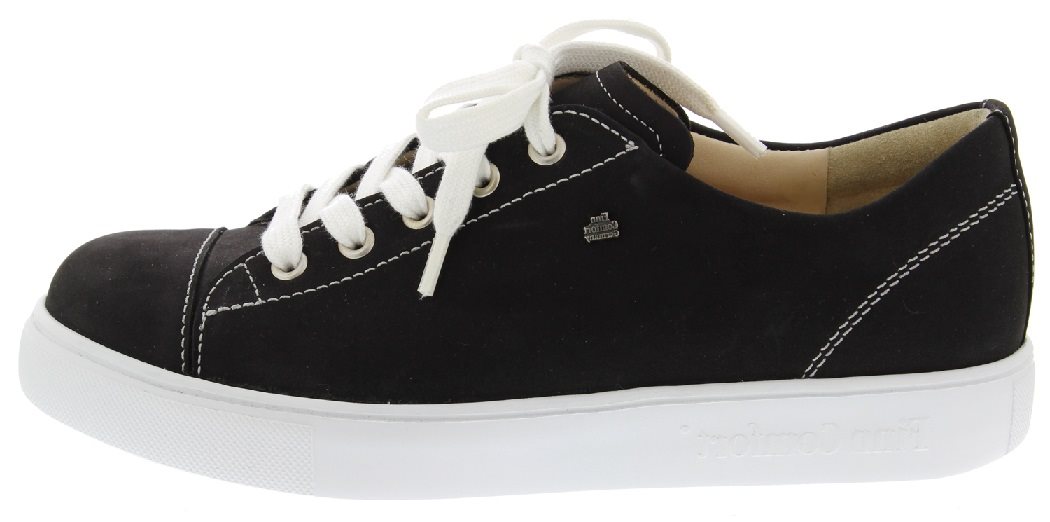 Finn Comfort dames veterschoen, model Mestre uit de TrendLine, zwart nubuck leer met een witte loopzool, valt als een wijdte H, geschikt voor de normale tot iets bredere voet, uitneembaar voetbed.