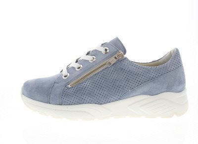 Solidus moderne dames sneaker op een ‘chunky’ afwikkelzool, model Mia. Dit is een breedste pasvorm op de Hills (H) en de Kea (K) concept met meer comfort rond de balwijdte. Voorzien van een rits voor het instapgemak met een derby sluiting voor meer aansluiting op maat. Blauw suède. Wijdte M, geschikt voor de zeer brede voet. De stevige afwikkelzool verlicht voorvoet gerelateerde klachten door de soepele afroldynamiek. Super comfortabel vanwege de 3D demping van de buitenzool, tussenlaag en dempende elementen van het uitneembare voetbed. Deze schoen laat je niet alleen maar lekker lopen, maar hiermee complimenteer je al je casual looks. Hakhoogte 38mm. Hielheffing 18mm. Impregneren met Collonil Carbon Pro