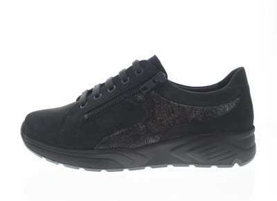 Solidus moderne dames sneaker op een ‘chunky’ afwikkelzool, model Mia. Dit is de breedste pasvorm op de Hills (H) en de Kea (K) concept met meer comfort rond de balwijdte. Voorzien van een rits voor het instapgemak met een derby sluiting voor meer aansluiting op maat. Zwart nubuck. Wijdte M, geschikt voor de zeer brede voet. De stevige afwikkelzool verlicht voorvoet gerelateerde klachten door de soepele afroldynamiek. Super comfortabel vanwege de 3D demping van de buitenzool, tussenlaag en dempende elementen van het uitneembare voetbed. Deze schoen laat je niet alleen maar lekker lopen, maar hiermee complimenteer je al je casual looks. Hakhoogte 38mm. Hielheffing 18mm. Impregneren met Collonil Carbon Pro