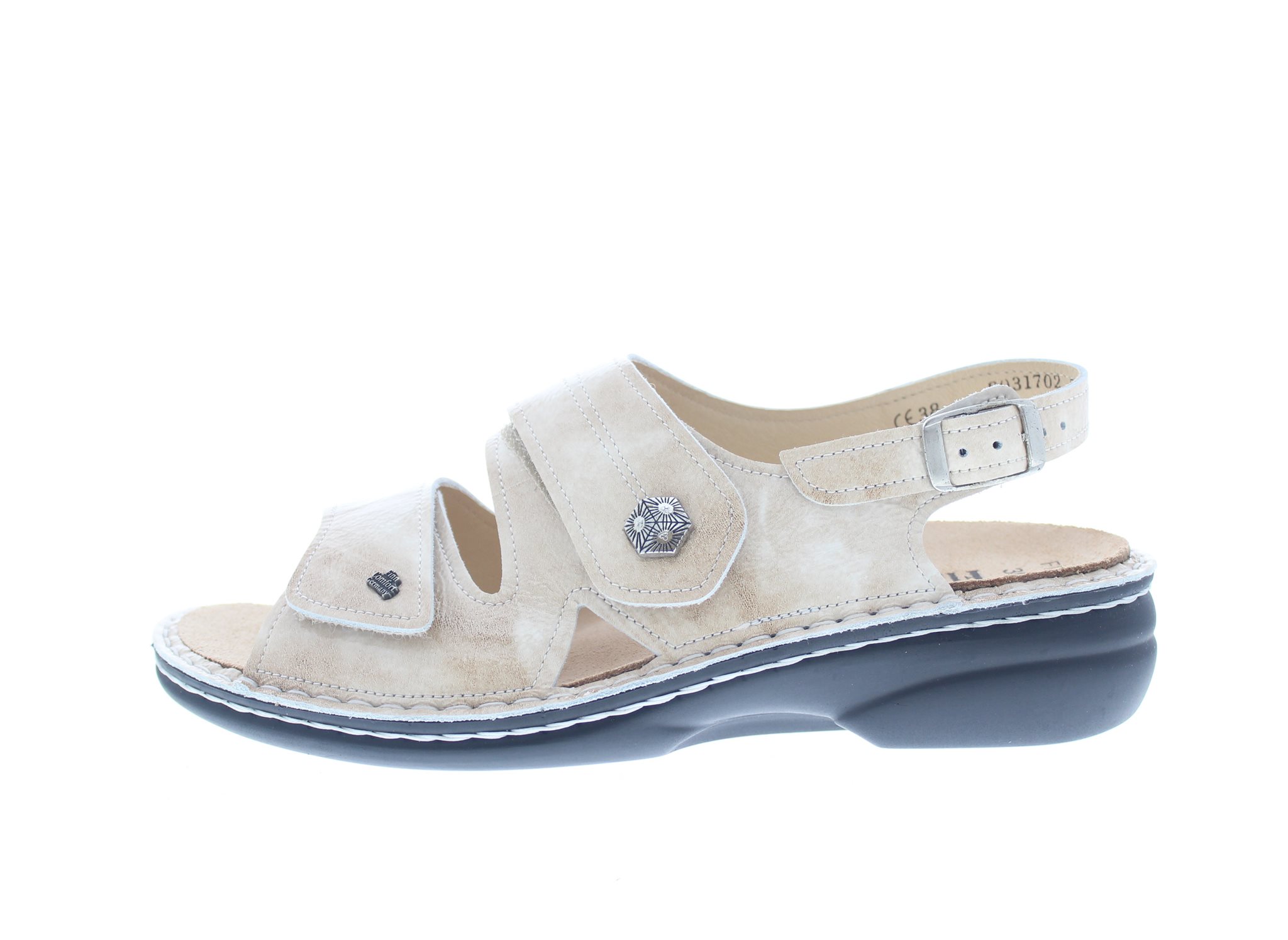Finn Comfort dames sandaal, model Milos uit de Classic lijn. Twee klittenbandsluitingen en een met gesp en drukknop verstelbare hielsluiting. Beige lakleer. Valt als een wijdte K, geschikt voor de brede voet. Uitneembaar ecologisch en anatomisch gevormde voetbed.