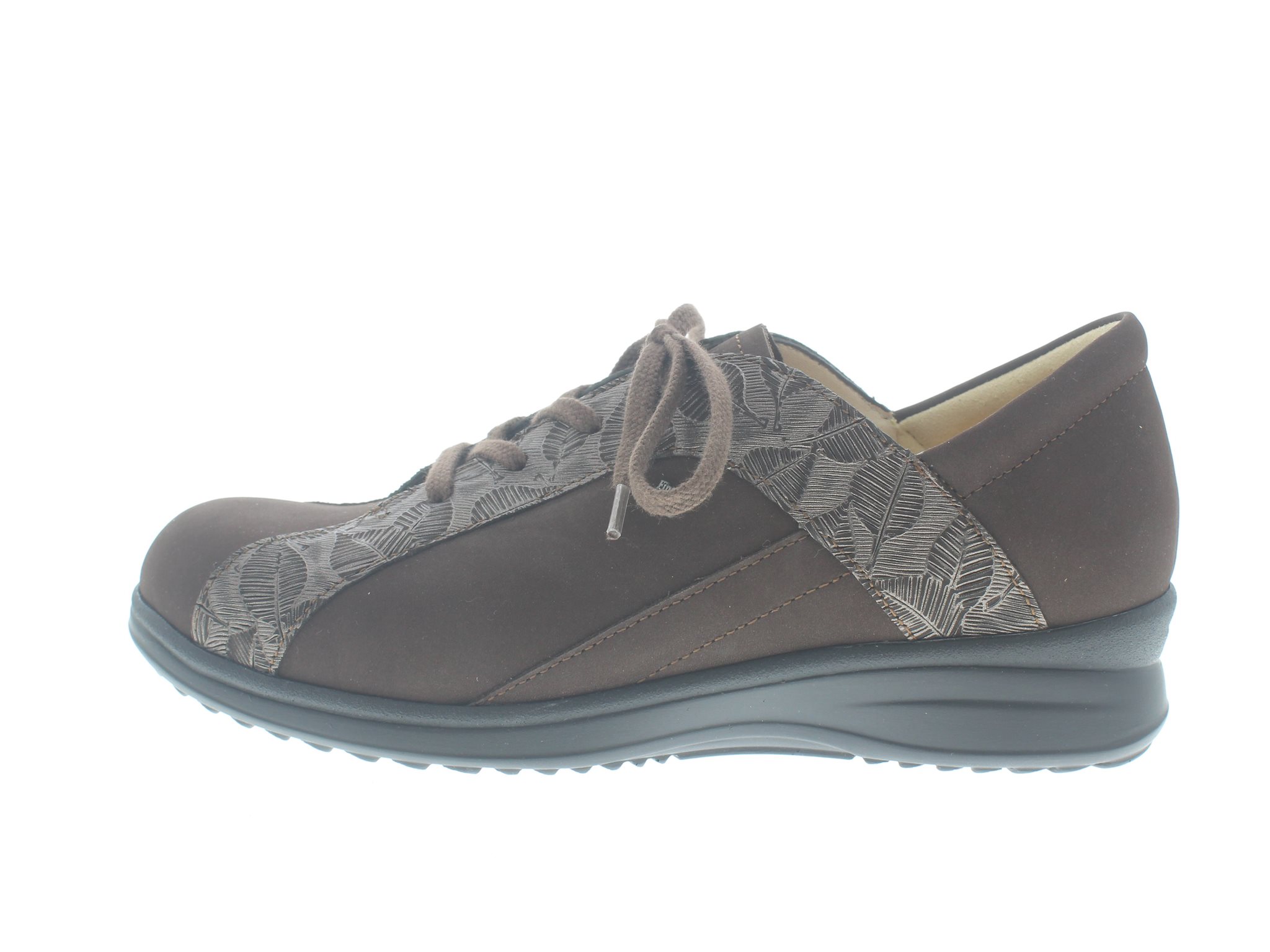 Finn Comfort dames veterschoen, model Mineola uit de Lady-Line, donker bruin nubuk met metallic geprint leer, valt als een wijdte K, geschikt voor de brede tot iets bredere voet. Uitneembaar voetbed.