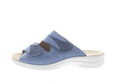 Solidus dames slipper, model Moni. Voorzien van een extra zachte binnenvoering en lekker breed rondom de bal van de voet, uitermate aangenaam bij een hallux valgus/bunion. Wijdte M, geschikt voor de brede voet. Twee verstelbare klittenbandsluitingen voor de gewenste pasvorm. Blauw nubuck. Uitneembaar voetbed. Hakhoogte 32mm. Hielheffing 18mm.