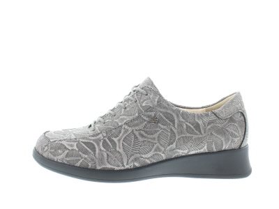 Finn Comfort dames veterschoen, model Narita uit de City lijn, grijs nubuck leer met bladeren print, valt als een wijdte J, geschikt voor de normale tot brede voet met een wat toegeknepen hielsluiting, uitneembaar voetbed. Extra stabiliteit door de trapezium gevormde hakpartij.