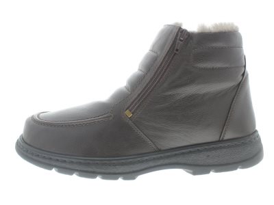 Solidus heren winterboot met een dubbele ritssluiting, model Natura Stiefel, zeer comfortabel aan en uittrekken van een volledig lamswol gevoerde boot om het koude weer mee te trotseren, stevig profiel om makkelijk door de sneeuw te lopen, geen voelbare stiknaden en daarom gunstig bij diabetische en reumatische klachten. Alsook een uitkomst bij klauw- en hamertenen en een overgevoelige hallux valgus. Bruin glad leer, wijdte K, geschikt voor de brede voet, uitneembaar voetbed.
