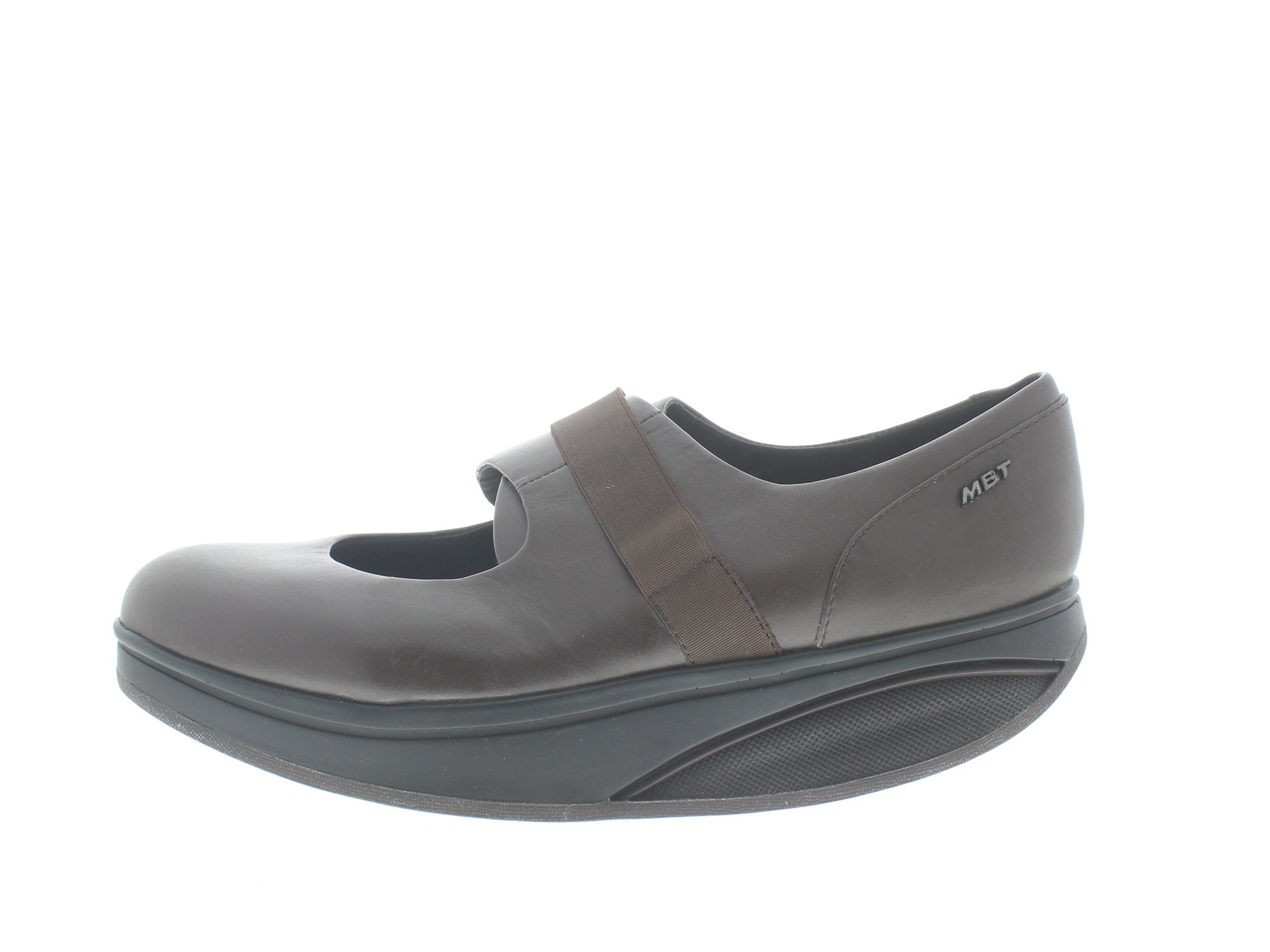 MBT dames instap-bandschoen, model New MJ, voorzien van een Performance (Level 3) afrolzool welke de meest instabiele is, geschikt voor de gevorderde MBT drager, elastische wreefsluiting die mee rekt aan de hand van de hoogte van je wreef, bruin glad leer, valt als een wijdte H, geschikt voor de normale tot iets bredere voet, uitneembaar voetbed.