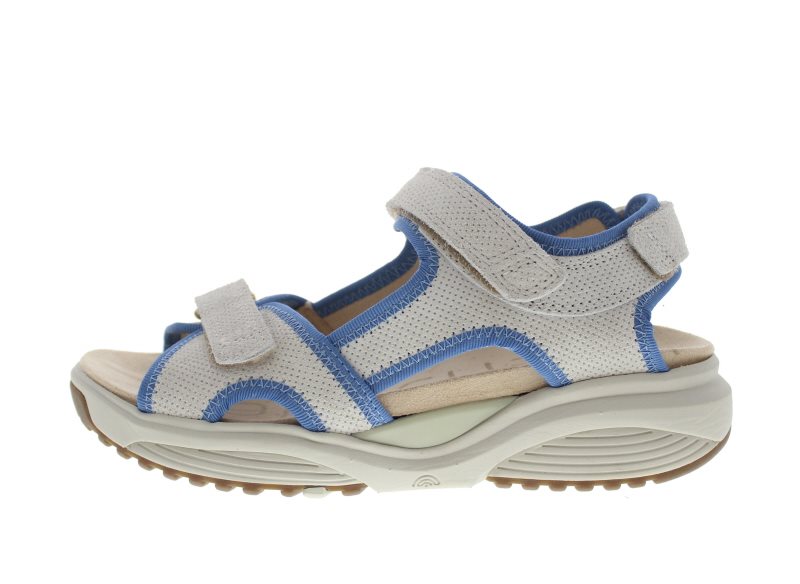 Xsensible dames sandaal, model Nikiti. Zeer comfortabele sandaal voor iedereen en bij uitstek comfortabel bij zere voeten, vanwege een speciaal ontwikkelde afrolzool met demping in de hiel en voorvoet. Het met klittenband vastzittende voetbed is uiteraard uitneembaar voor je eigen aangemeten zolen. Wit suède met synthetische materialen. Wijdte H, geschikt voor de iets bredere voet. Dit model heeft drie verstelbare klittenbandsluitingen waarvan één rondom de hiel.