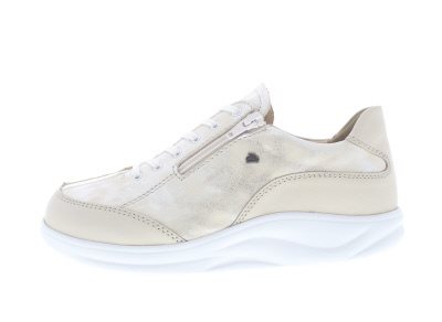 Finn Comfort dames veterschoen, model Otaru uit de Finnamic afwikkel lijn. Schoenen uit deze lijn zijn zeer geschikt bij het ontlasten en verlichten van hiel en voorvoet gerelateerde klachten, en zorgt tevens voor een rechtere rug houding en ondersteuning bij rugklachten. Beige/crème leer met een rits voor het instapgemak en een gepolsterde tong voor extra comfort op de wreef. Valt tussen een wijdte H en K, geschikt voor de bredere voet. Uitneembaar ecologisch en anatomisch gevormde voetbed. Hakhoogte 32mm. Hielheffing 12mm. Impregneren met Collonil Carbon Pro