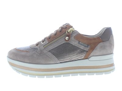 Mephisto dames sneaker, model Panthea. Hippe schoen met een verstijfde zool en een late teensprong, die de actieradius vergroot in combinatie met de hielheffing van 2cm. Geschikt bij rigide en gelimiteerde teenklachten. De rits is functioneel en vergemakkelijkt het aan en uittrekken. Taupe suède gecombineerd met cognac nubuck en leren details. Valt als een wijdte H, geschikt voor de iets bredere voet. Uitneembaar voetbed.