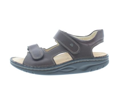 Finn Comfort sandaal met twee verstelbare klittenbanden, model Perm, wijdte K geschikt voor de brede voet. Finnamic afrolzool voor betere afwikkeling en bij hielspoorklachten. Bruin nubuckleer. Hakhoogte 12 mm. Hieldrop 12mm.