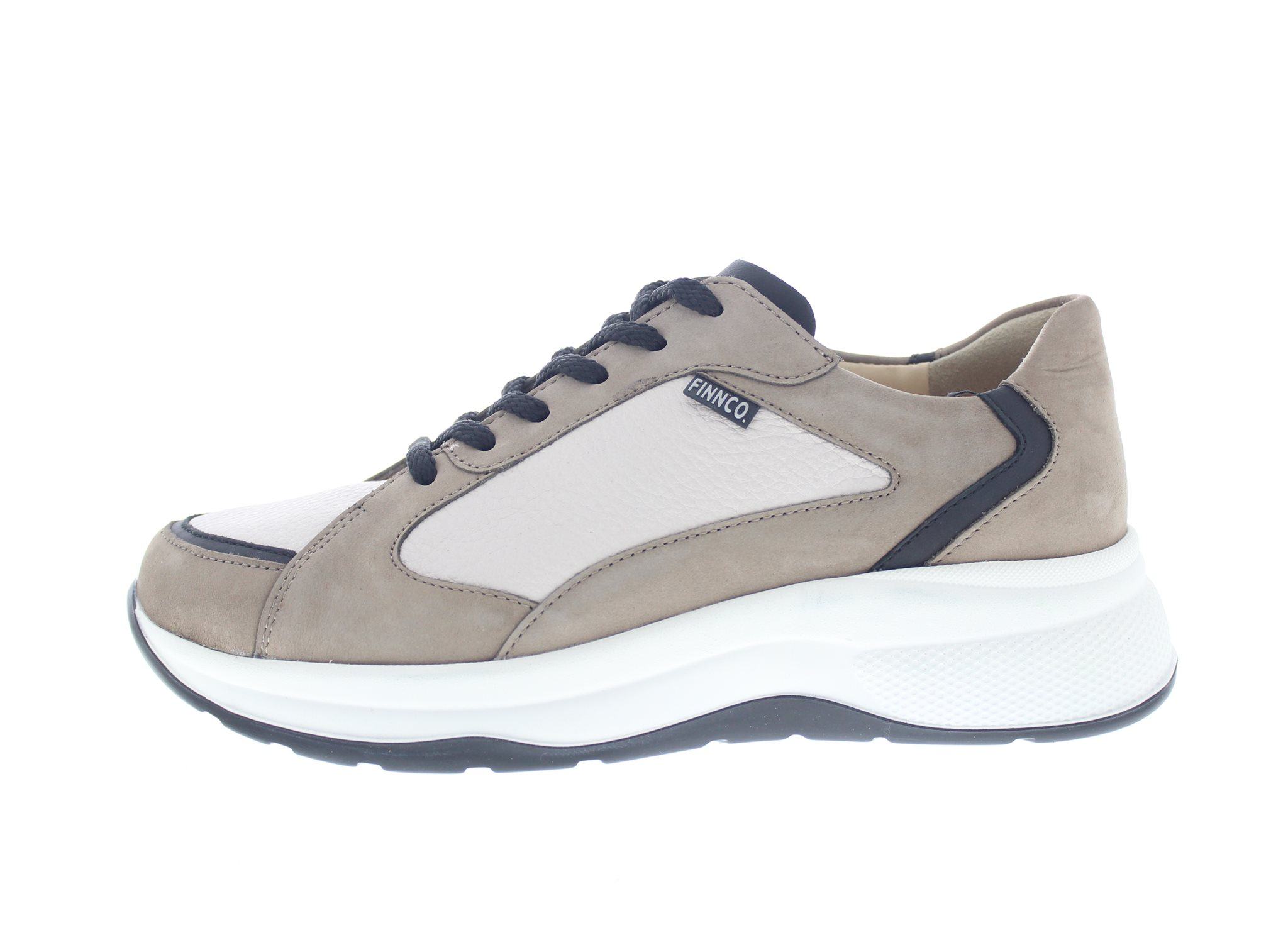 Finn Comfort robuuste dames sneaker met een chunky afwikkelzool, model Piccadilly uit de TrendLine reeks. Beige leer en nubuck. Valt als een wijdte H, geschikt voor de iets bredere voet. Uitneembaar anatomisch gevormde voetbed. De buitenzool heeft dempende eigenschappen en wikkelt heerlijk af, ideaal bij gevoelige voorvoeten en bij hielklachten.