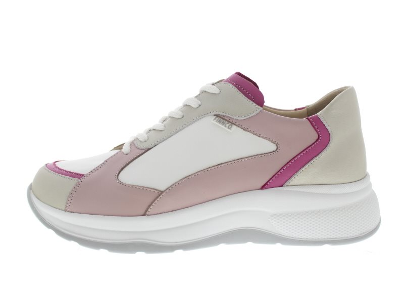 Finn Comfort robuuste dames sneaker met een chunky afwikkelzool, model Piccadilly uit de TrendLine. Wit met roze en champagne kleurig leer. Valt als een wijdte H, geschikt voor de iets bredere voet. Uitneembaar ecologisch en anatomisch gevormde voetbed. De buitenzool heeft dempende eigenschappen en wikkelt heerlijk af, ideaal bij gevoelige voorvoeten en hielklachten. Hakhoogte 45mm. Hielheffing 20mm. Onderhoudt deze schoenen met Collonil Carbon Pro voor de beste bescherming.