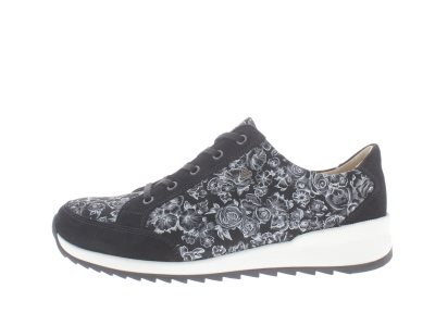 Finn Comfort dames veterschoen, model Pordenone uit de CitySport lijn, casual style sneaker, valt goed te combineren met vrije tijdskleding vanwege de tijdloze look, soepele afwikkelzool met een stevig profiel, zwart nubuck leer met een rozenpatroon, valt als een wijdte H, geschikt voor de normale tot iets bredere voet, uitneembaar ecologisch en anatomisch gevormde voetbed.