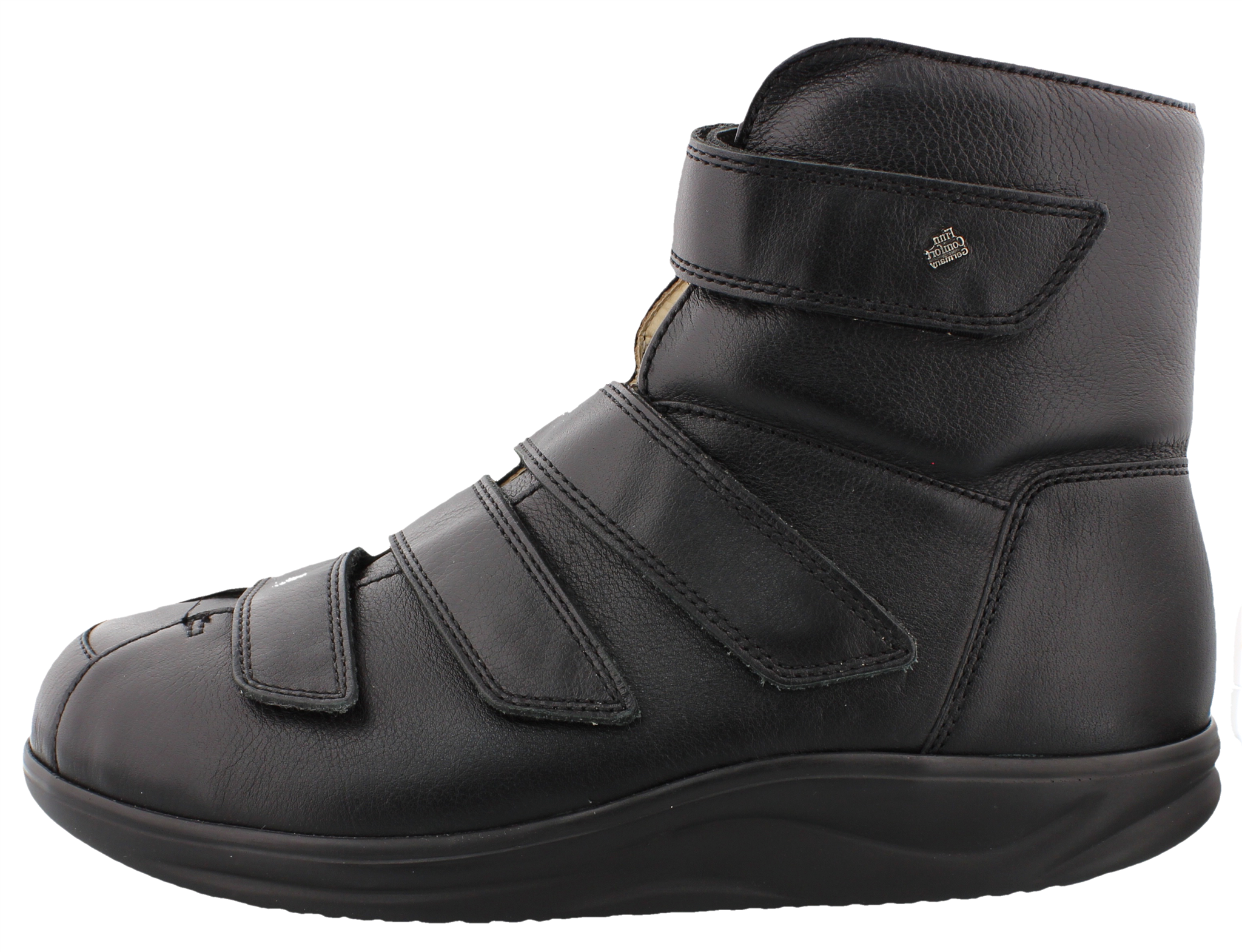 Finn Comfort Profylaxe laarsje met vier klittenbanden, model 97304, wijdte M geschikt voor de zeer brede en gevoelige voet, zwart gladleer, zacht verwisselbaar voetbed, hakhoogte 12 mm. Speciale afwikkelzool die de voet helpt bij het lopen. Dit laarsje heeft een ruim inschot aan de voorzijde.