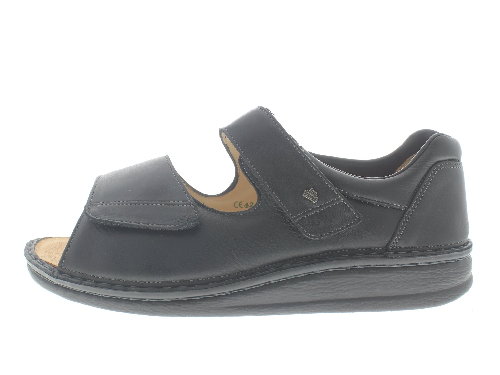 Finn Comfort Prophylaxe sandaal, model 96200. Speciaal ontwikkeld voor het beschermen van de gevoelige voet door reuma, diabetes en vaatlijden, middels een volledig gepolsterde binnenvoering. Voorzien van twee verstelbare overslag klittenbandsluitingen. Zwart glad leer. Valt als een wijdte H, geschikt voor de iets bredere voet. Uitneembaar ecologisch en anatomisch gevormde voetbed met een dempende tussenlaag voor extra comfort, dat enigszins je eigen voetafdruk aanneemt.