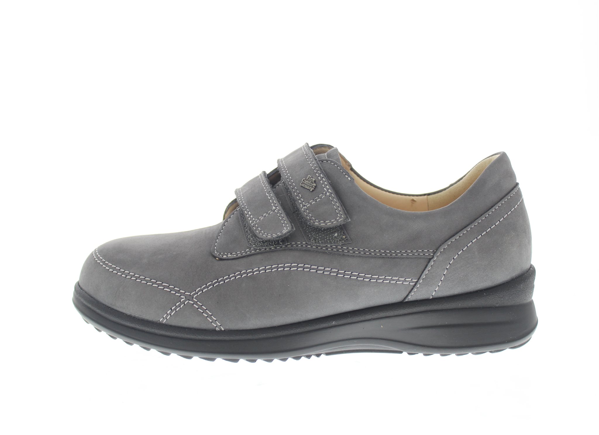 Finn Comfort dames klittenbandschoen, model 96522 Prophylaxe. Extra comfortabel en gepolsterd bij diabetische en reumatische gerelateerde voetklachten. Grijs nubuck. Wijdte K, geschikt voor de brede en gevoelige voet. Uitneembaar voetbed.