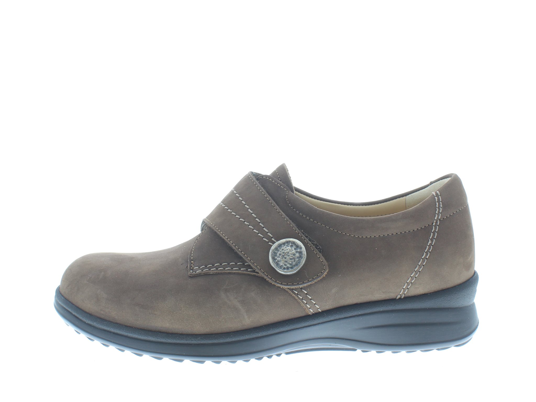 Finn Comfort dames klittenbandschoen, model Pula uit de LadyLine series. Zeer comfortabele pasvorm, met iets meer teenbox ruimte dan in een standaard schoen. Bruin nubuck leer met contrasterende stiksels en een enkele overslag klittenbandsluiting. Valt als een wijdte K, geschikt voor de brede voet. Uitneembaar ecologisch en anatomisch gevormde voetbed.
