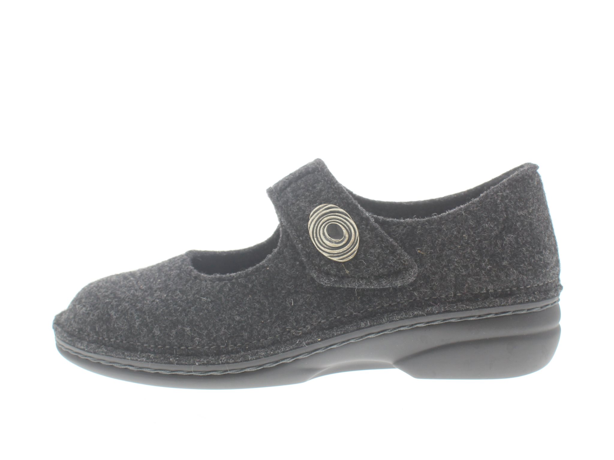 Finn Comfort dames pantoffel met een dichte hiel, model Ramsau uit de Classic lijn. Voorzien van een enkele verstelbare overslag klittenbandsluiting op de wreef, verfraaid met een sierknop. Antraciet wolvilt, lekker warm bij koude voeten. Valt als een wijdte K, geschikt voor de brede voet. Comfortabel voor binnen, maar door de stevige zool ook rondom het huis te dragen. Uitneembaar ecologisch en anatomisch gevormde voetbed.