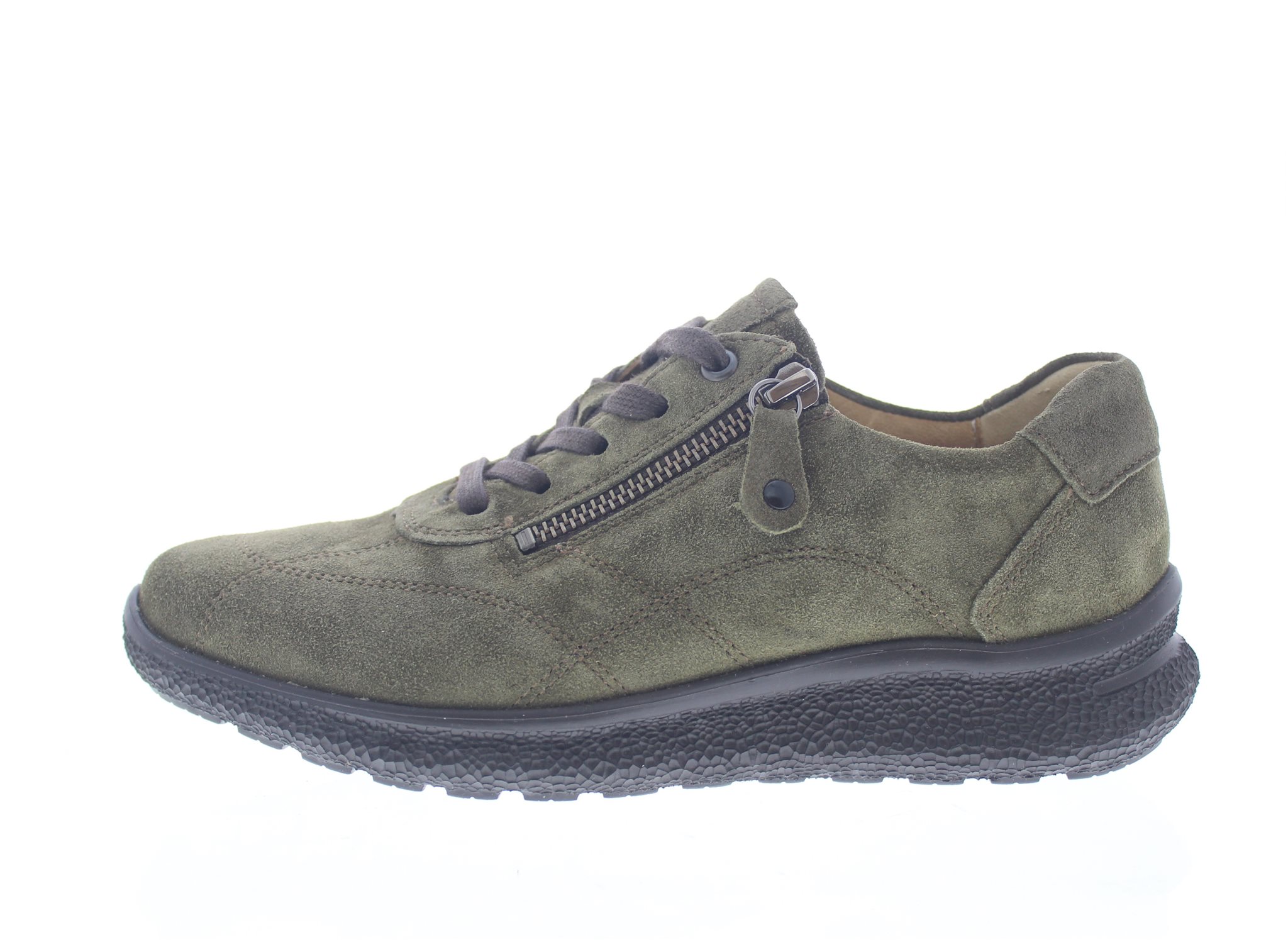 Hartjes sportieve dames sneaker, model Rap. Uitgevoerd met een dempende EXTRALIGHT onderwerk met een soepele teensprong. Rits voor het instapgemak aan de laterale zijde. Groen suède. Wijdte K, geschikt voor de brede voet. Uitneembaar ecologische voetbed. Dit model is chroomarm.
