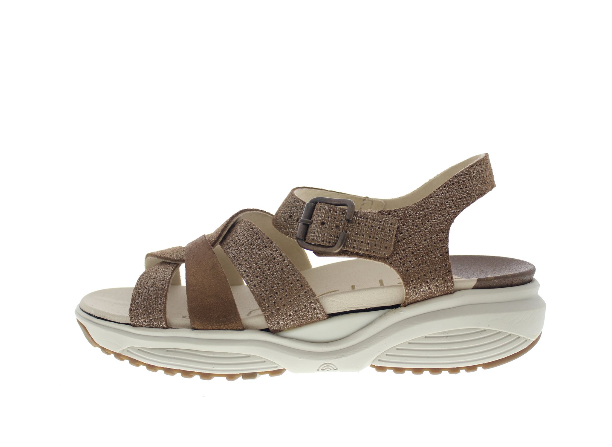 Xsensible dames sandaal, model Rhodos. Zeer comfortabele sandaal voor iedereen en bij uitstek comfortabel bij zere voeten, vanwege een speciaal ontwikkelde afrolzool met demping in de hiel en voorvoet. Het met klittenband vastzittende voetbed is uiteraard uitneembaar voor je eigen aangemeten zolen. Brons suède. Wijdte G, geschikt voor de normale voet. Dit model heeft een met gesp verstelbare sluiting rondom de wreef en enkel.