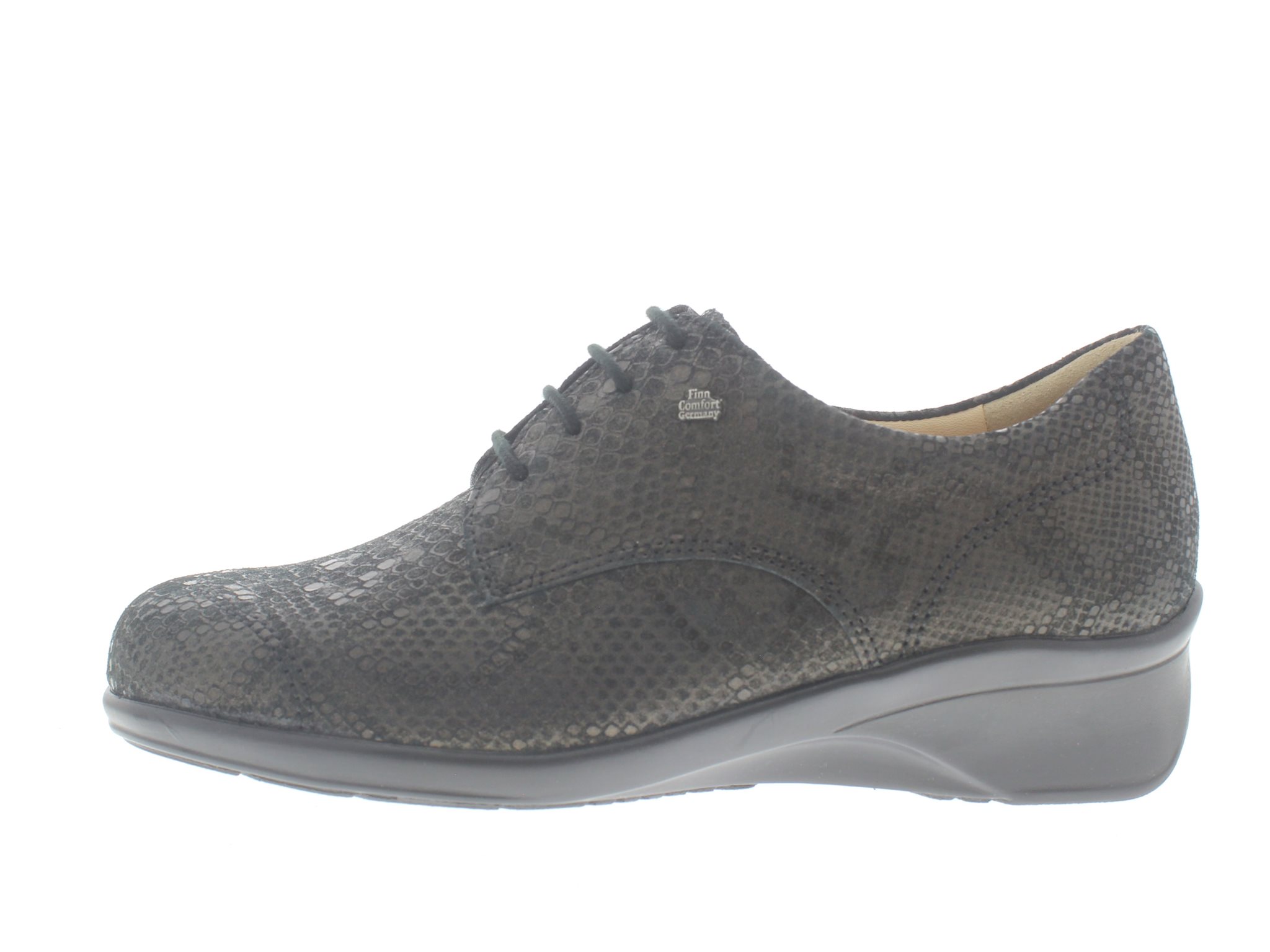 Finn Comfort dames veterschoen, model Rosario uit de City lijn. Voorzien van een flexibele zool met een hakverhoging voor een betere rugpositie. Zwart/brons nubuck leer met een pythonprent. Valt tussen een wijdte G en H. Geschikt voor de normale tot iets bredere voet. Uitneembaar ecologisch en anatomisch gevormde voetbed. Finn Comfort inlegzolen zijn los verkrijgbaar.