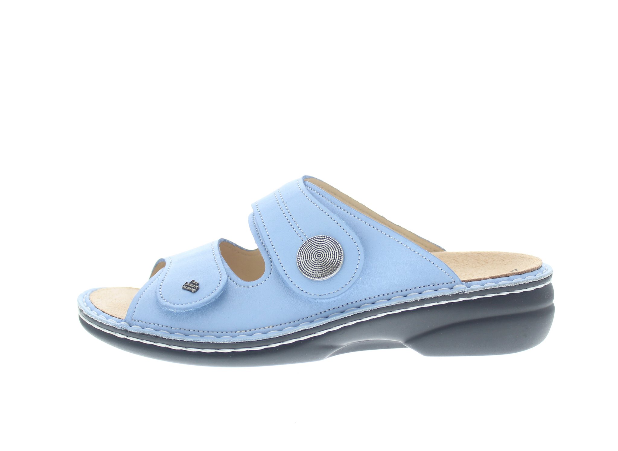 Finn Comfort dames slipper, model Sansibar uit de Classic lijn. Voorzien van twee verstelbare klittenbandensluitingen op de voet met dichte flanken voor extra support. Blauw leer met een sierknop. Valt als een wijdte K, geschikt voor de iets bredere tot brede voet. Uitneembaar ecologisch en anatomisch gevormde voetbed.