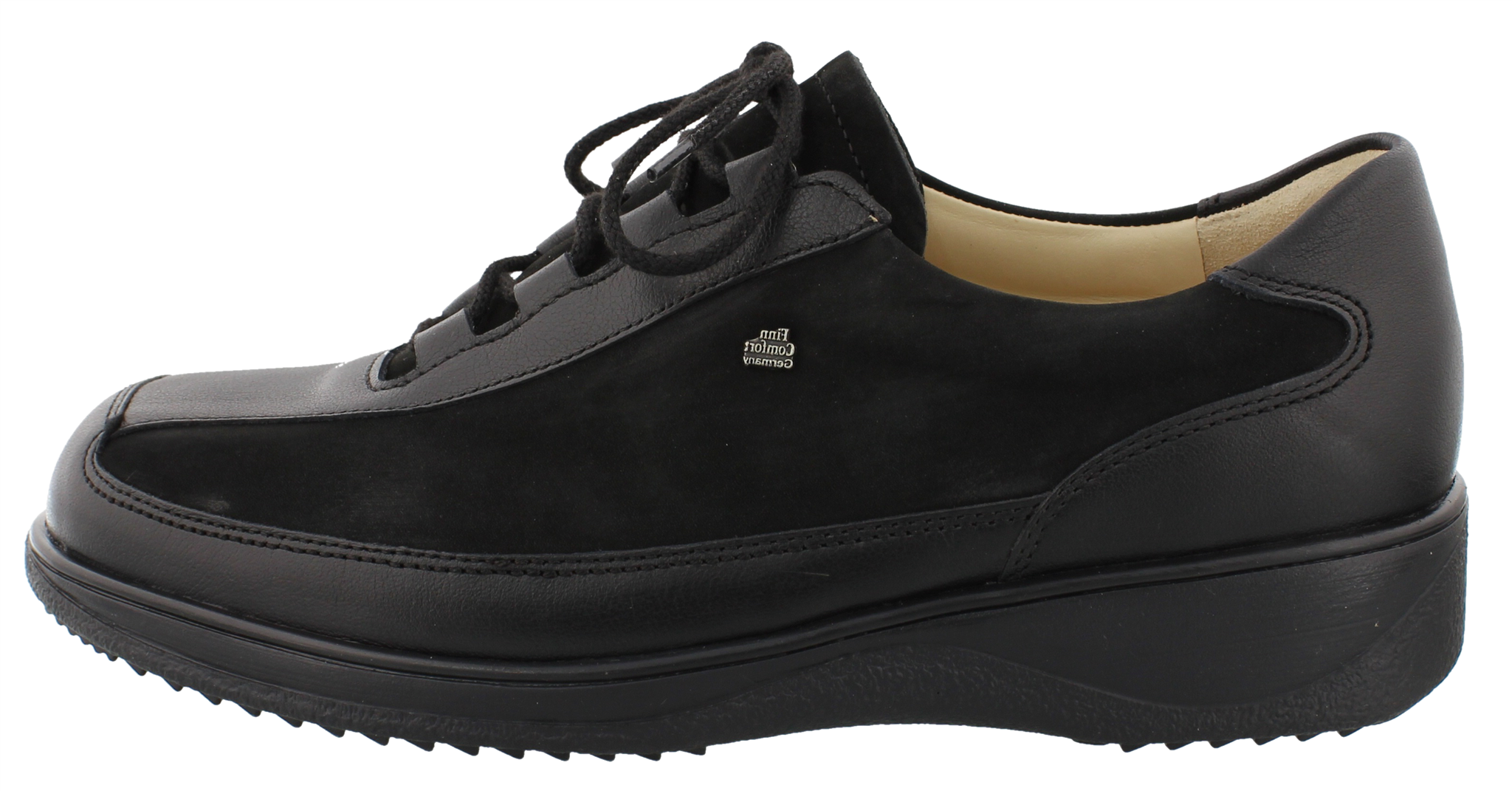 Finn Comfort dames veterschoen, model Santiago uit de LadyLine series, valt als een wijdte K, geschikt voor de brede voet, zwart met nubuck gecombineerd leer, uitneembaar voetbed.