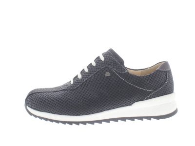 Finn Comfort dames veterschoen, model Sarnia uit de City Sport lijn, zwart glad leer met schubpatroon, valt als een wijdte H, geschikt voor de normale tot iets bredere voet, uitneembaar voetbed.