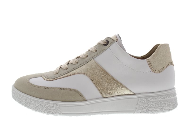 Hartjes minimalistische dames sneaker, model Sophie. Lichtgewicht ‘EXTRALIGHT’ flexibele loopzool met een stabiele hielpartij. Beige met wit en goud suède en leer. Wijdte H, geschikt voor de iets bredere voet. Uitneembaar voetbed. Dit model is chroomarm.