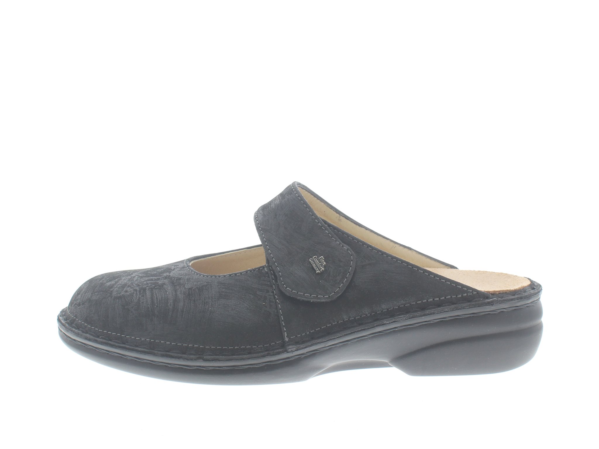 Finn Comfort dames muil, model Stanford uit de Classic lijn. Voorzien van een enkele verstelbare overslag klittenbandsluiting op de wreef, verfraaid met een sierknop. Zwart nubuck leer met print. Valt als een wijdte K, geschikt voor de brede voet. Comfortabel voor zowel binnen als buiten. Uitneembaar ecologisch en anatomisch gevormde voetbed.