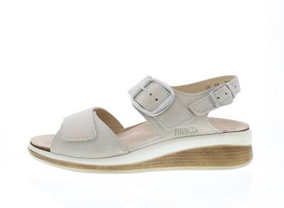 Finn Comfort dames sandaal, model Surinam uit de Classic lijn. Met een combinatie van klittenband- gespen en een drukknop sluiting om deze sandaal helemaal naar wens aan je voet af te stellen. De sleehak dient als een stevige fundament en middenvoet ondersteuning, terwijl je geniet van een ecologisch en anatomisch gevormde voetbed, dat tevens met klittenband vast zit en uitneembaar is voor een eigen steunzool. Beige/champagne opgeruwd glad leer. Valt tussen een wijdte H en K, geschikt voor de iets bredere voet.