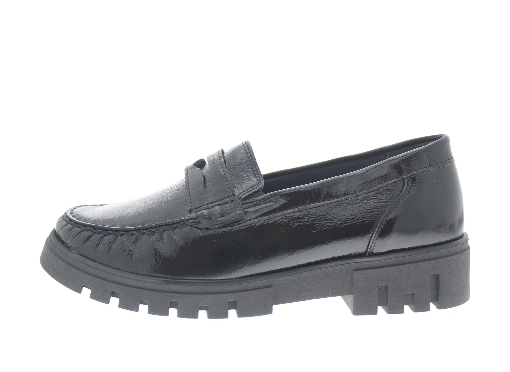 Zwart lakleer met een stevig maar lichtgewicht antislip zool. Wijdte H, geschikt voor de iets bredere voet. Uitneembaar voetbed.