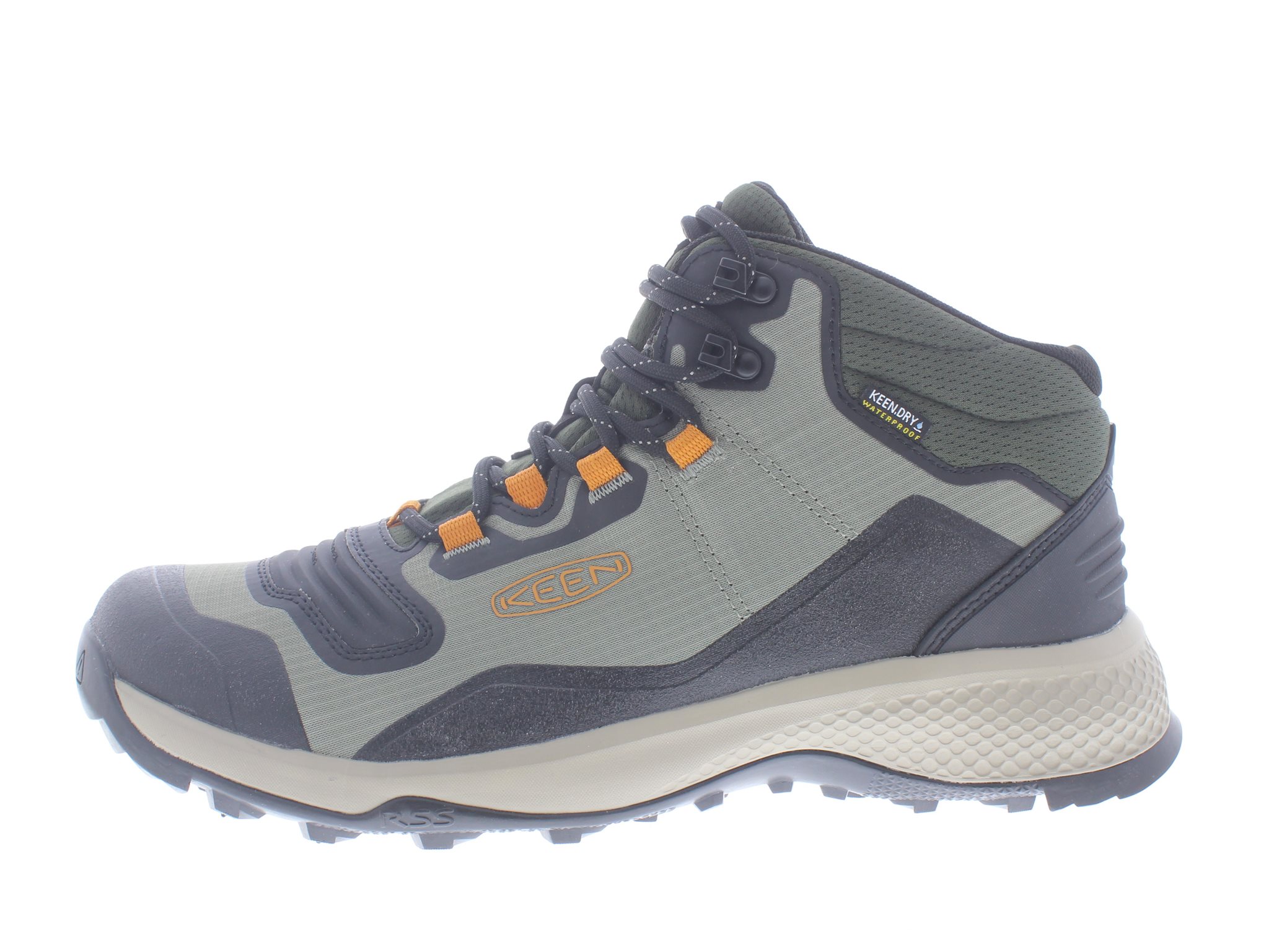 Keen heren wandelschoen, model Tempo Flex Mid WP M, voorzien van een antislip slijtvaste rubberen slijtzool met een stevige maar soepele afwikkeling, rechte pasvorm, TPU afwerking rondom de neus en de flanken. KEEN.DRY waterdichte technologie, groen met oranje synthetisch gerecyclede materialen waarin je instapt als een sok, valt als een wijdte G, geschikt voor de normale voet. Uitneembaar voetbed.
