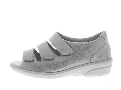 Solidus dames profylaxe sandaal, model Therapo, met drie klittenbandsluitingen en een dichte hiel voor extra stabiliteit, de binnenvoering is van een zachte kwaliteit velours materiaal en volledig gepolsterd, geschikt bij diabetische en reumatische voetklachten, en ook klauw- en hamertenen. Beige nubuck leer met een metallic finish, wijdte W, geschikt voor de brede en kwetsbare voet. Het superzachte voetbed kan vervangen worden voor een eigen steunzool.