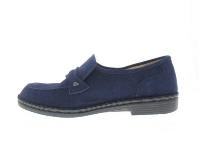 Finn Comfort heren instapper, model Toledo met hand gestikte zool uit de City lijn. Blauw suède. Valt tussen een wijdte G en H, geschikt voor de normale tot iets bredere voet. Uitneembaar ecologisch en anatomisch gevormde voetbed.