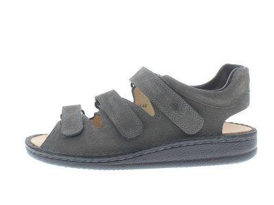 Finn Comfort heren sandaal, model Tunis uit de Classic lijn. Grijs nubuck, met dichte flanken voor extra support en drie verstelbare klittenbandsluitingen op de voet. Valt tussen een wijdte G en H, geschikt voor de normale tot iets bredere voet. Uitneembaar ecologisch en anatomisch gevormde voetbed. De hielband is niet verstelbaar. Dit model is niet beschikbaar in halve maten.