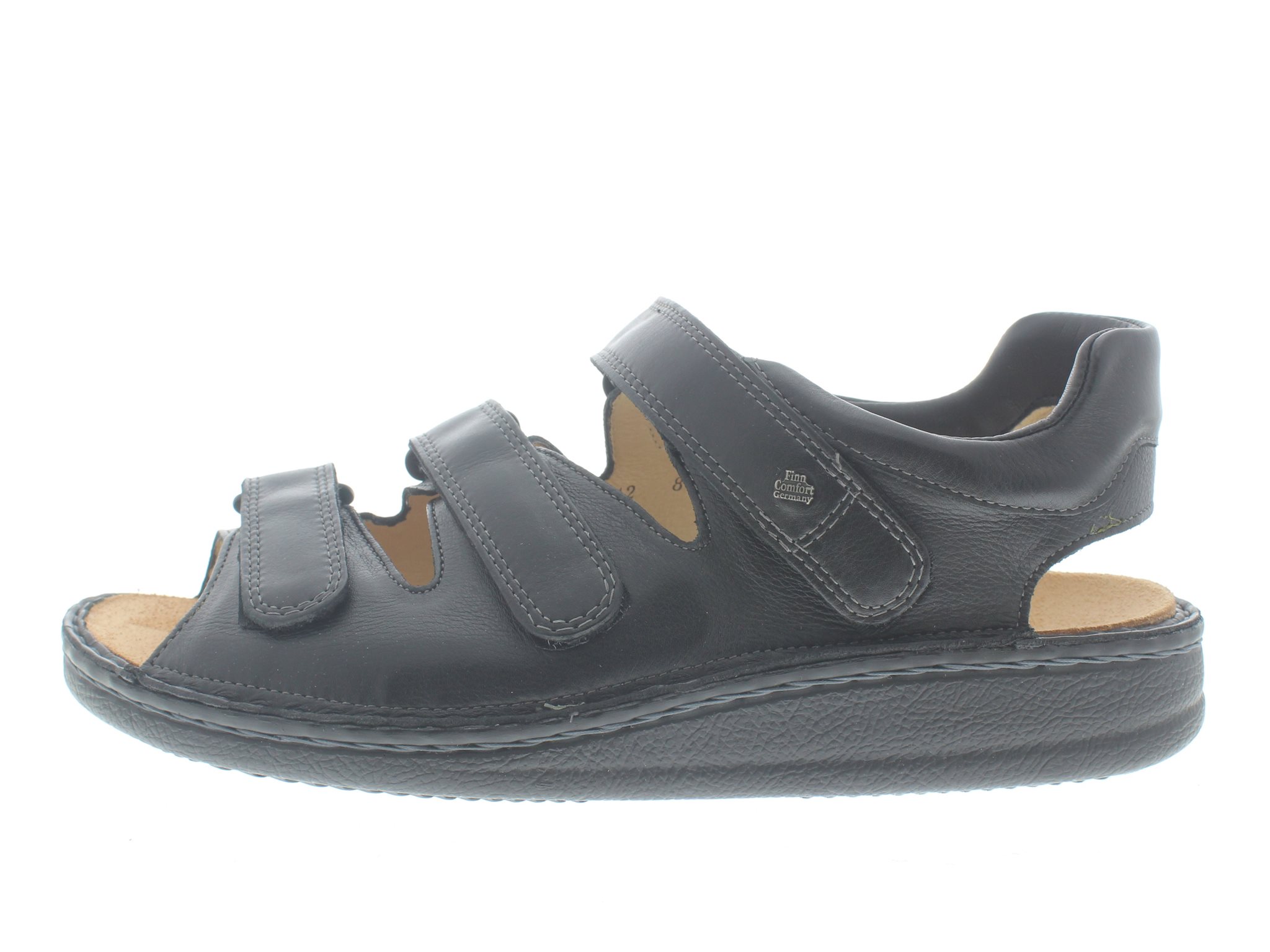 Finn Comfort heren sandaal, model Tunis uit de Classic lijn. Zwart leer, met dichte flanken voor extra support en drie verstelbare klittenbandsluitingen op de voet. Valt tussen een wijdte G en H, geschikt voor de normale tot iets bredere voet. Uitneembaar ecologisch en anatomisch gevormde voetbed. De hielband is niet verstelbaar. Dit model is niet beschikbaar in halve maten.