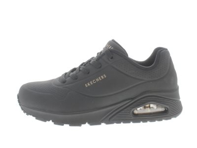 Skechers dames ‘all black’ lifestyle sneaker, model ‘Stand on Air’ die qua vormgeving onder alle kleding staat in je gewenste kleur. Zwart imitatie nubuck look, Vegan verantwoord, met een buitenzool die de afwikkeling stimuleert en voorzien is van een luchtkamer bij de hiel dat pijn kan verlichten bij hielklachten. Valt als een wijdte G tot H, geschikt voor de normale tot iets bredere voet. Dit model heeft een vaste ‘memory foam’ voetbed.