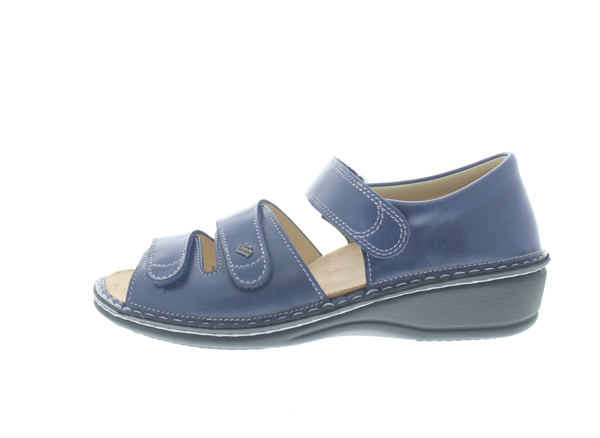 Finn Comfort dames sandaal met dichte hiel en drie verstelbare klittenbanden, model Usedom uit de Classic lijn. Blauw leer. Valt als een wijdte K, geschikt voor de brede voet. Uitneembaar ecologisch en anatomisch gevormde voetbed.