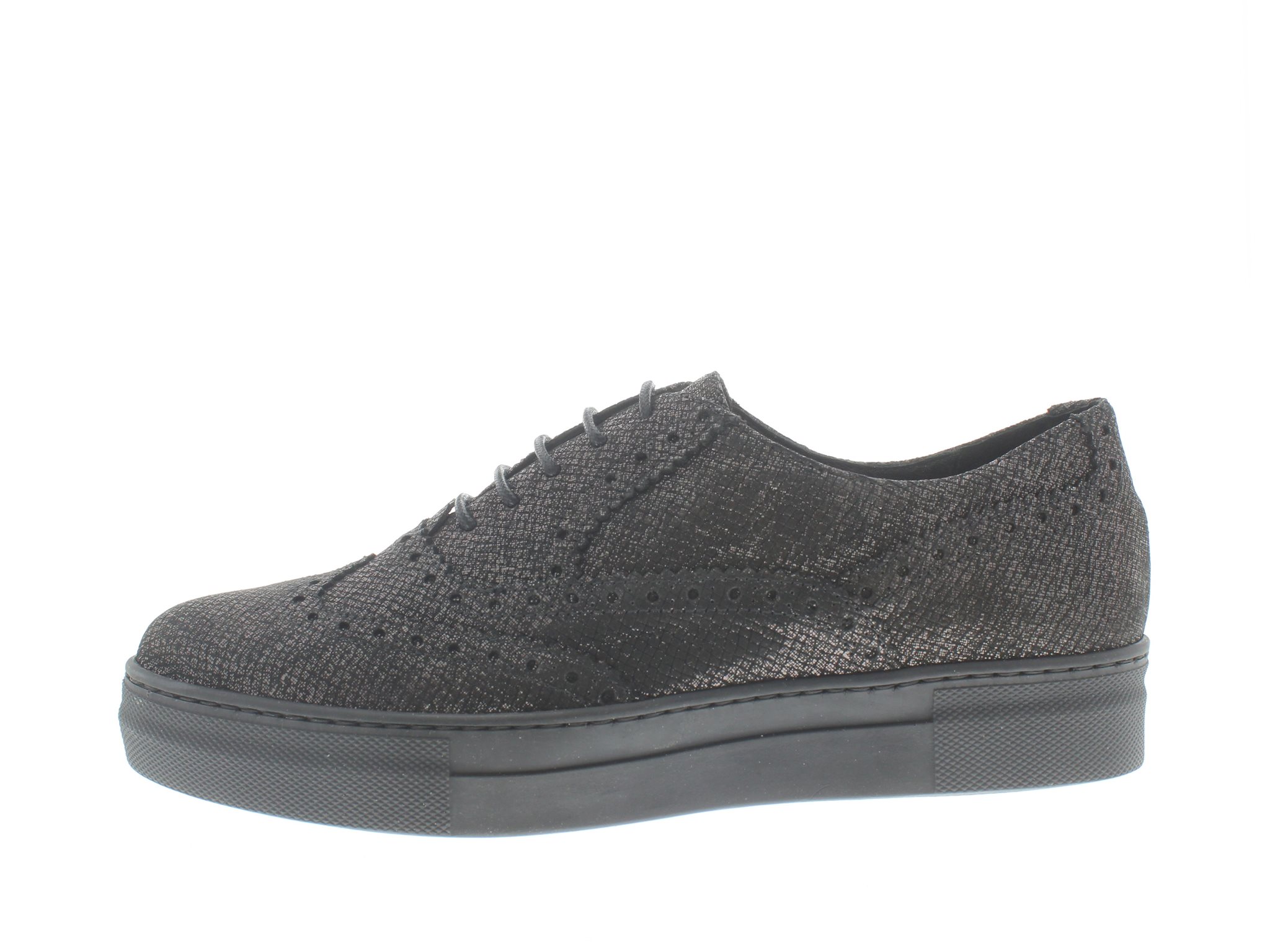 Roberto D’Angelo hippe dames brogue, plateau zool met uitneembare voetbed, zwart zilver multi nubuck leer met een metallic finish, de wijdte of breedte valt als een wijdte G. De loopzool is stijf.