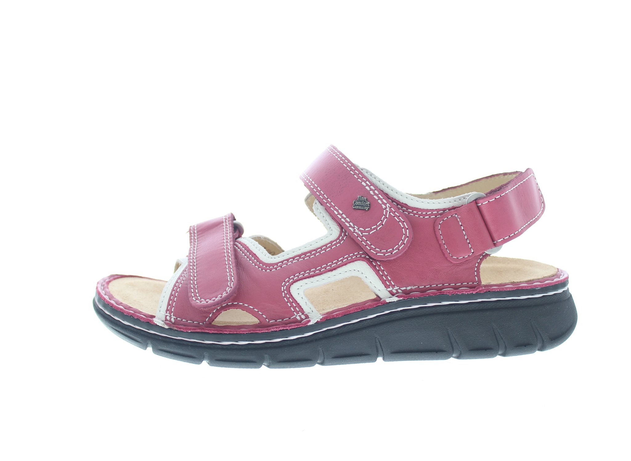 Finn Comfort heren sandaal, model Wanaka-S uit de ClassicSoft lijn. Met drie verstelbare klittenbandsluitingen waarvan één op de hiel. Sportieve uitstraling met een makkelijk afwikkelbare flexibele loopzool. Roze leer met witte details. Valt tussen een wijdte H en K, geschikt voor de iets bredere voet. Uitneembaar ecologisch en anatomisch gevormde voetbed met een dempende tussenlaag voor extra comfort.
