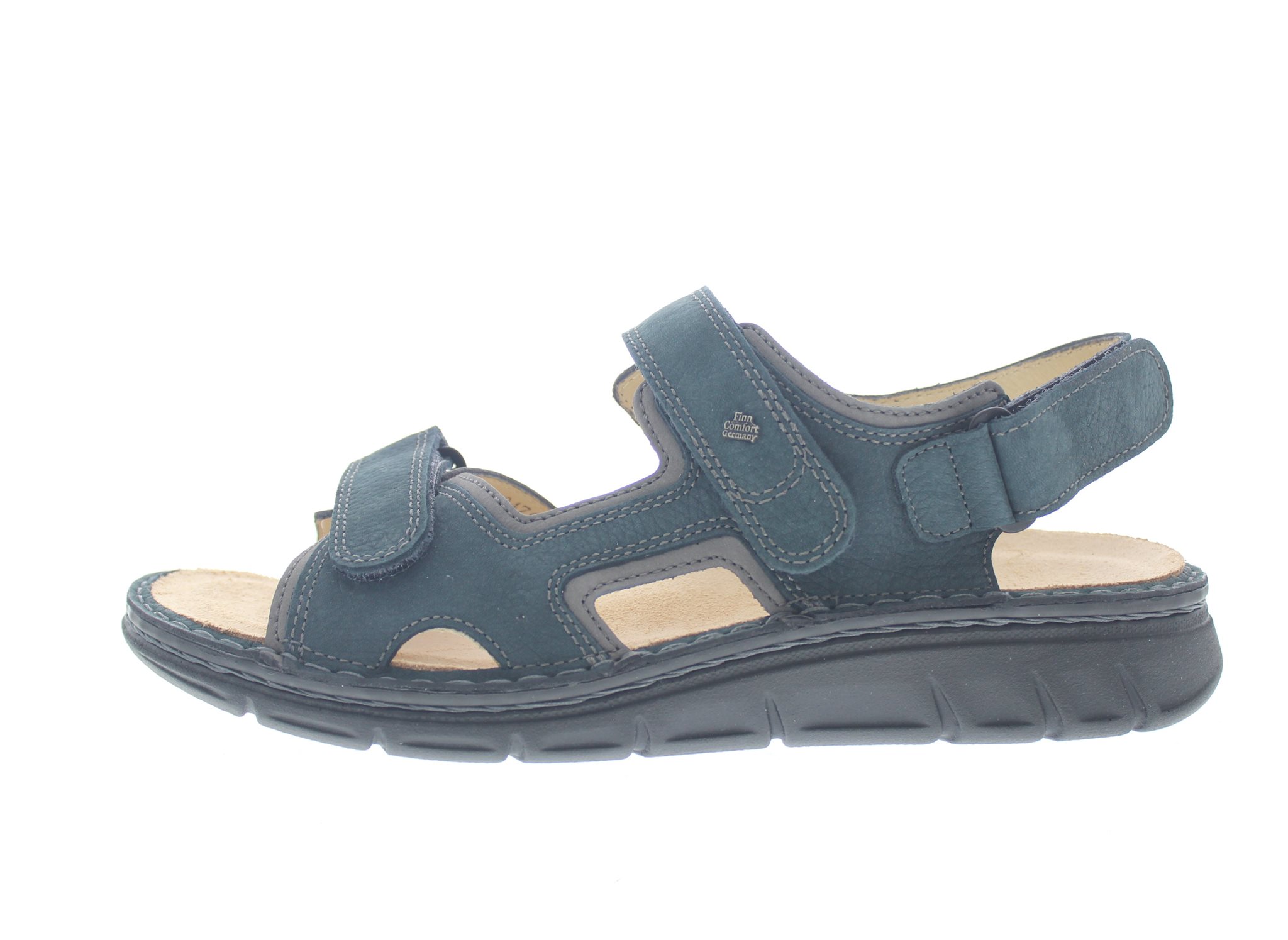 Finn Comfort heren sandaal, model Wanaka-S uit de ClassicSoft lijn. Met drie verstelbare klittenbandsluitingen waarvan één op de hiel. Sportieve uitstraling met een makkelijk afwikkelbare flexibele loopzool. Blauw nubuck met grijze details. Valt tussen een wijdte H en K, geschikt voor de iets bredere voet. Uitneembaar ecologisch en anatomisch gevormde voetbed met een dempende tussenlaag voor extra comfort.