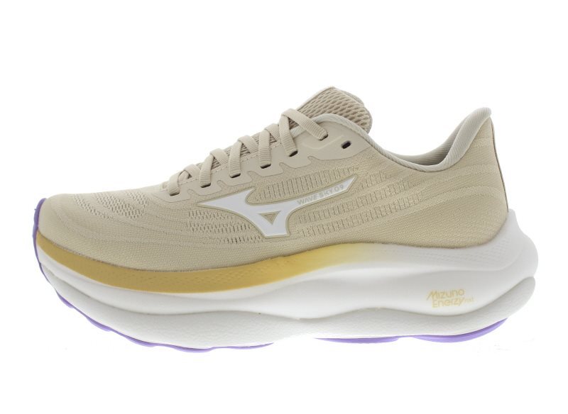 Mizuno Enerzy dames runner, model Wave Sky 9 W. Voorzien van een dubbel-dempende zool en een verlengde afwikkel-ondersteuning tot aan het grote teengewricht. Met een Mizuno Enerzy super schokabsorberende tussenzool die 293% zachter en 56% veerkrachtiger is dan eerder gebruikte materialen. Speciaal ontworpen voor en door hardlopers die het ultieme zwevende gevoel willen ervaren, en natuurlijk casual te dragen voor een sportieve look. Beige geweven materiaal. Valt als een wijdte G tot H, geschikt voor de gemiddelde voet. Hakhoogte 40mm. Hielheffing 8mm.