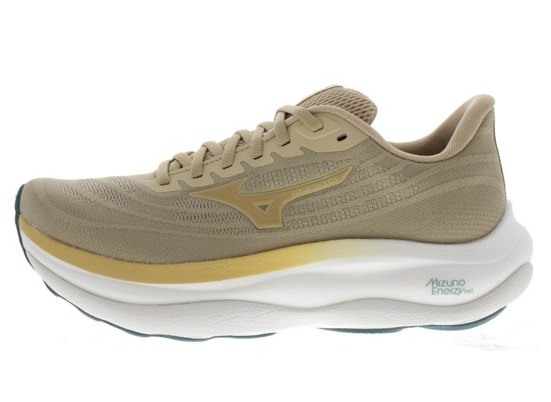 Mizuno Enerzy heren runner, model Wave Sky 9 M. Voorzien van een dubbel-dempende zool en een verlengde afwikkel-ondersteuning tot aan het grote teengewricht. Met een Mizuno Enerzy super schokabsorberende tussenzool die 293% zachter en 56% veerkrachtiger is dan eerder gebruikte materialen. Speciaal ontworpen voor en door hardlopers die het ultieme zwevende gevoel willen ervaren, en natuurlijk casual te dragen voor een sportieve look. Beige geweven materiaal. Valt als een wijdte G tot H, geschikt voor de gemiddelde voet. Hakhoogte 40mm. Hielheffing 8mm.