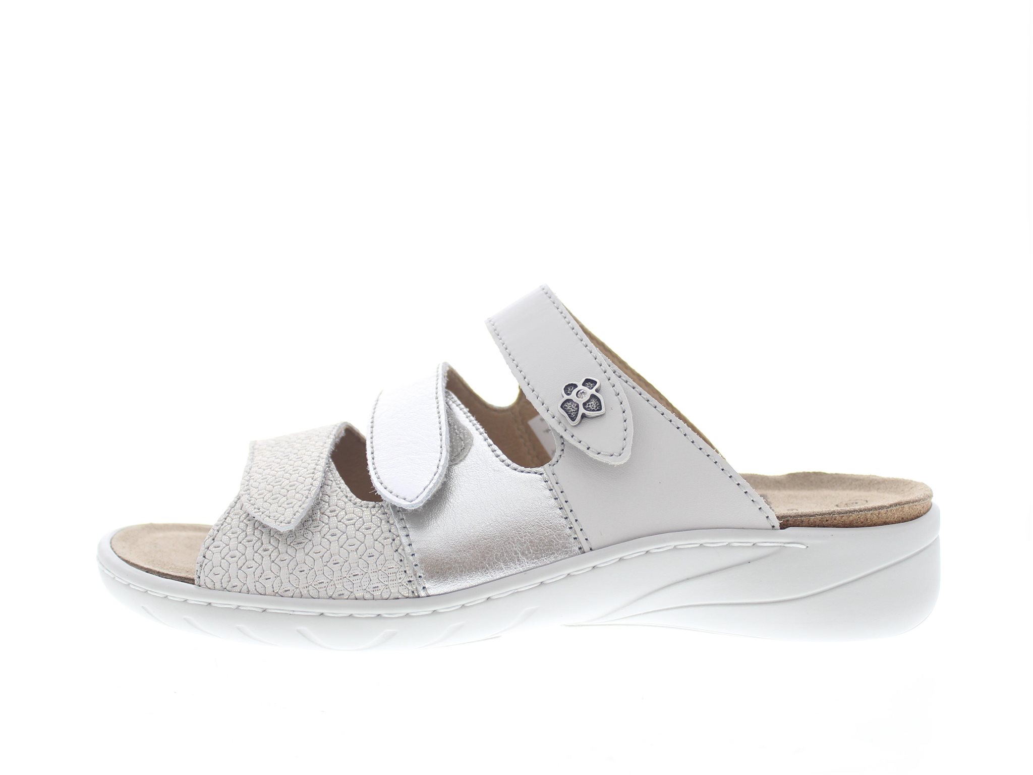 Solidus dames slipper, model Wellness Special. Voorzien van drie verstelbare klittenbanden. Dik anatomisch gevormde voetbed van kurk, met een zachte velours deklaag. De lichte kuipvorm zorgt voor iets meer hielstabiliteit. Crème nubuck met leer. Wijdte G, geschikt voor de normale tot iets smallere voet. Uitneembaar voetbed. Hakhoogte 30mm. Hielheffing 14mm.
