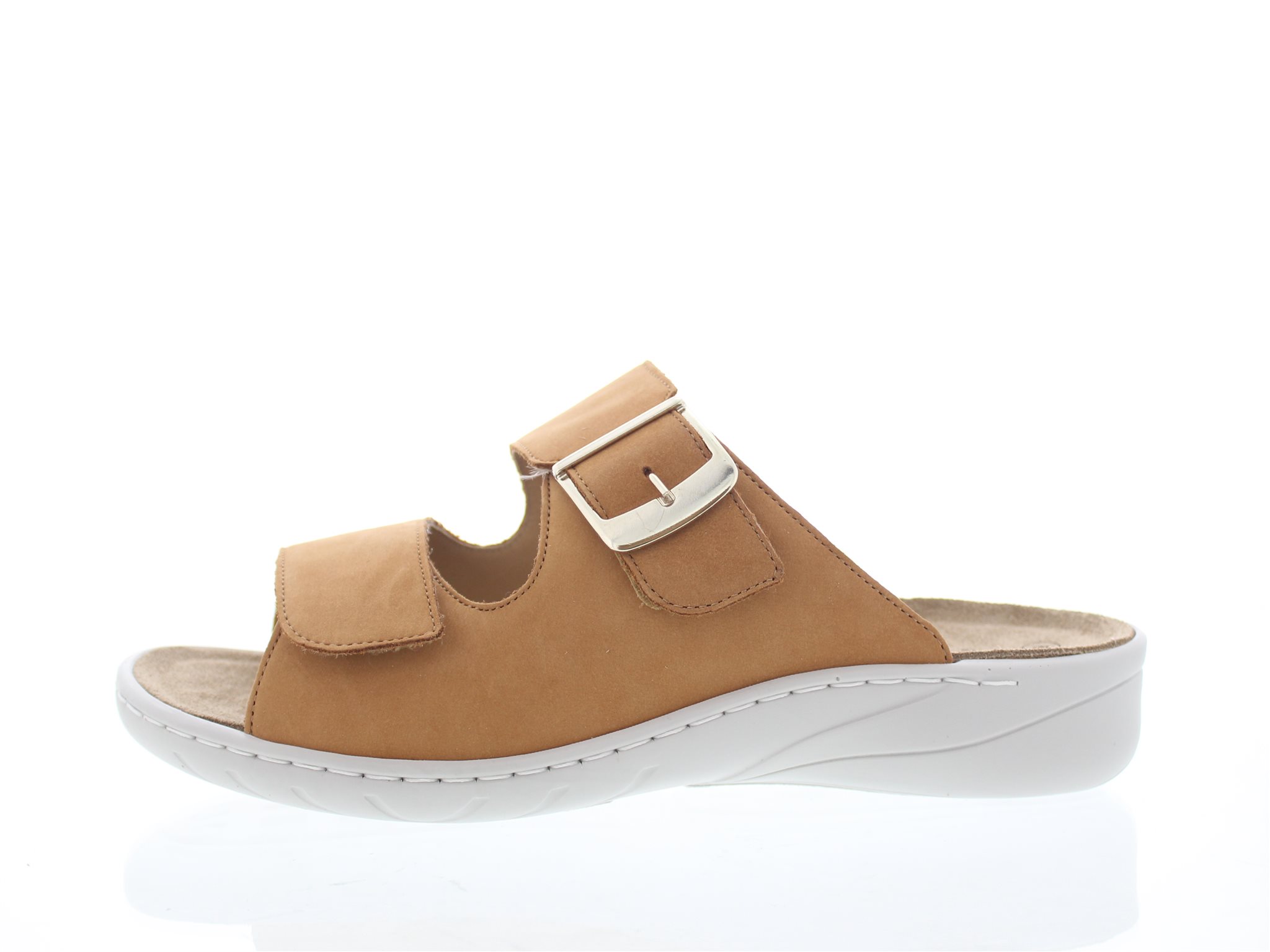 Solidus dames slipper, model Wellness Spezial, met twee verstelbare klittenbanden, dik kurken – anatomisch gevormde – uitneembare voetbed met een zachte velours deklaag, lichte kuipvorm voor iets meer hielstabiliteit. Muskaat bruin nubuck leer. Wijdte G, geschikt voor de normale tot iets smallere voet. Hakhoogte 30mm. Hielheffing 14mm.