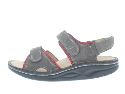 Finn Comfort dames sandaal, model Yuma uit de Finnamic afwikkel lijn. Grijs nubuck leer met rode accenten. Drie verstelbare klittenbandsluitingen, waaronder één op de hiel. Uitneembaar ecologisch en anatomisch gevormde voetbed met een dempende tussenlaag. Valt als een wijdte H, geschikt voor de iets bredere voet. Finnamic afrolzolen zijn uiterst geschikt bij het ontlasten en verlichten van hiel en voorvoet gerelateerde klachten. Dit model heeft een Europese maatboog en is daardoor alleen verkrijgbaar in hele maten. Uniseks model, afhankelijk van de kleur en verkrijgbare maat.